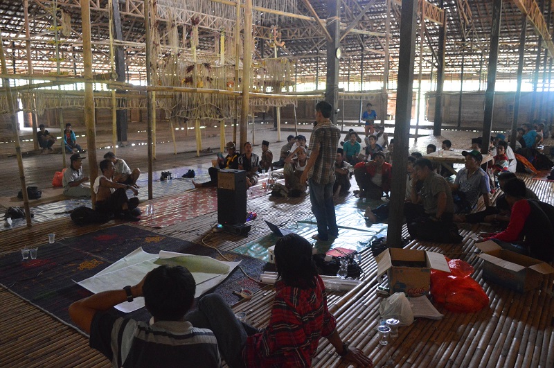 Members of the Balai communities of Loksado, Meratus Mountains, attending a meeting in their Balai Adat (house of worship), held by local and national NGOs. (Jazak Akbar Hidayat) |
