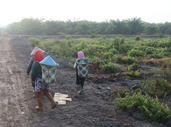 A group of female casual workers going to work for a palm oil company with lanjung (traditional baskets) on their back/Hanina Naura Fadhila