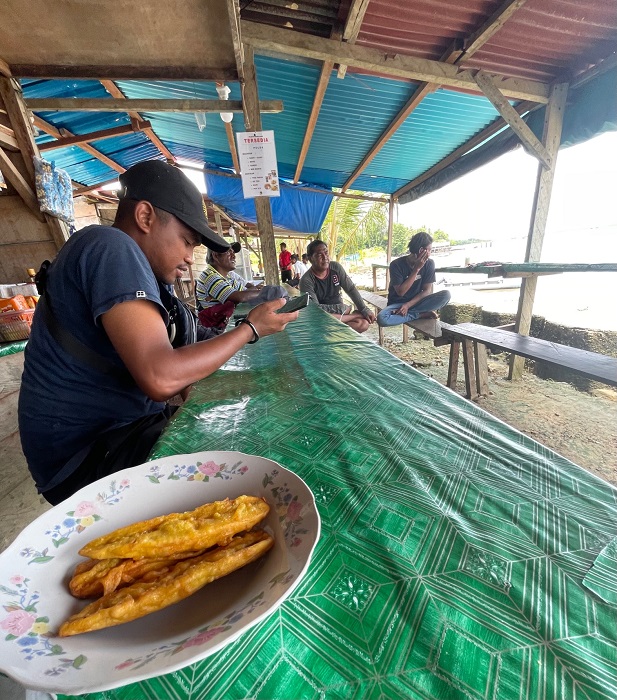 A small kedai by the newly built fishing port, a few groups of seafarers came to enjoy food and watch a boxing match or just to chill on solid ground before back to sailing, Blakang Wamar, 2021 / AA. Wardani