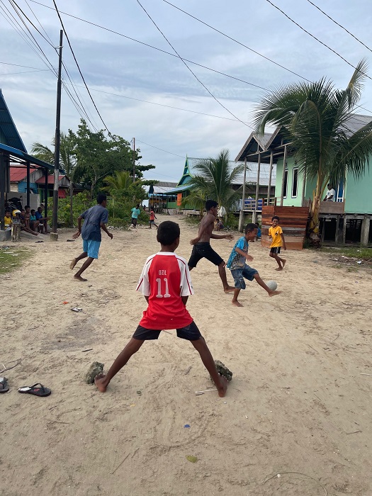 Kids smiling and playing football in a seashore village on a late afternoon, with others sitting on the terrace to watch, Marbali, Dobo, 2021 / AA. Wardani